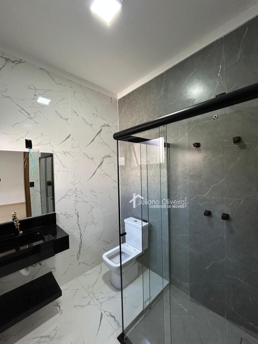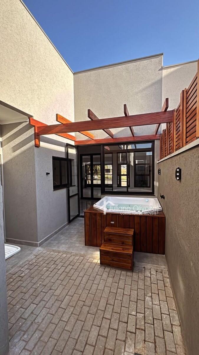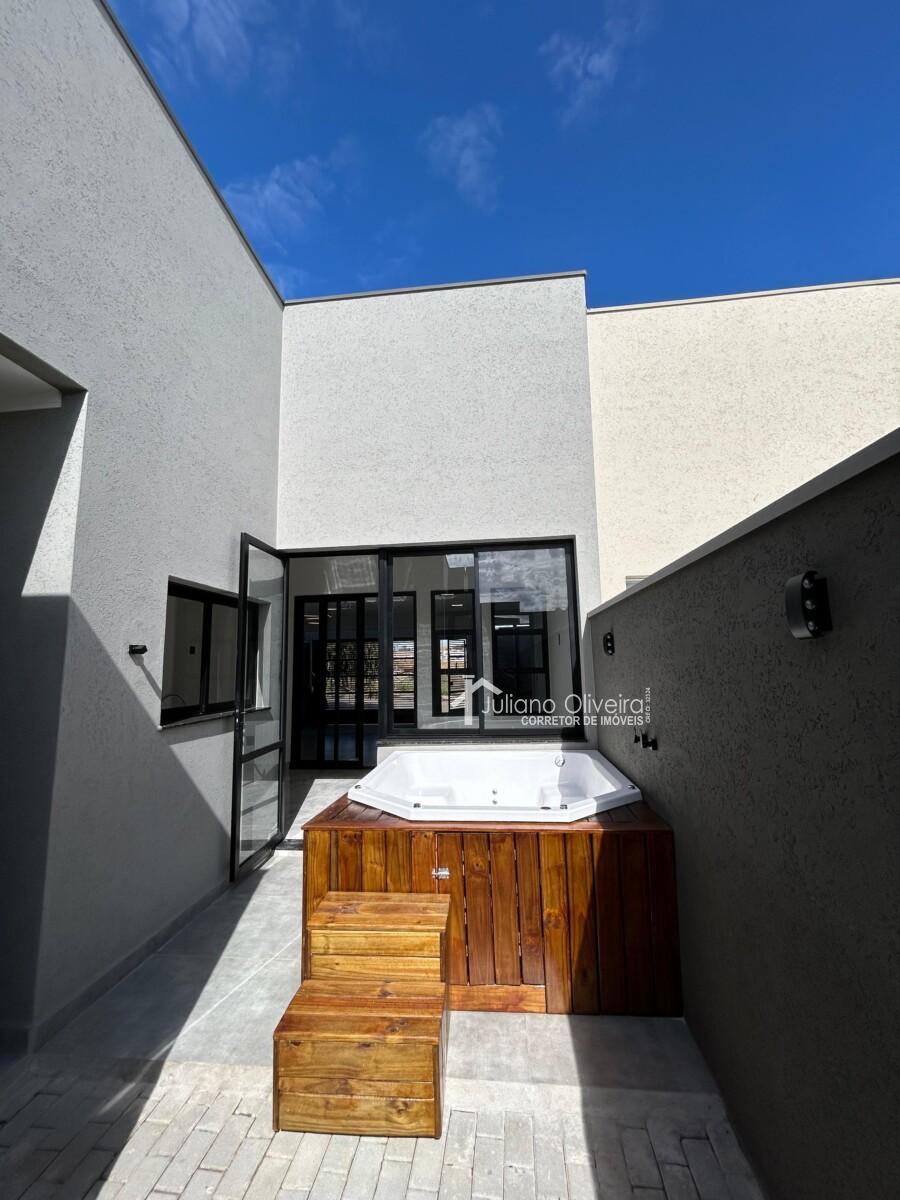 Casa com 123m² de área construída sobre o terreno de 162,50m², contendo: 3 quartos sendo 1 suíte, sala de TV, jantar e cozinha integrados com pé direito alto, quintal com deck de madeira e uma banheira de spa para 6 pessoas, banheiro social, área gourmet com churrasqueira, lavabo, área de serviço e 2 vagas de garagem.