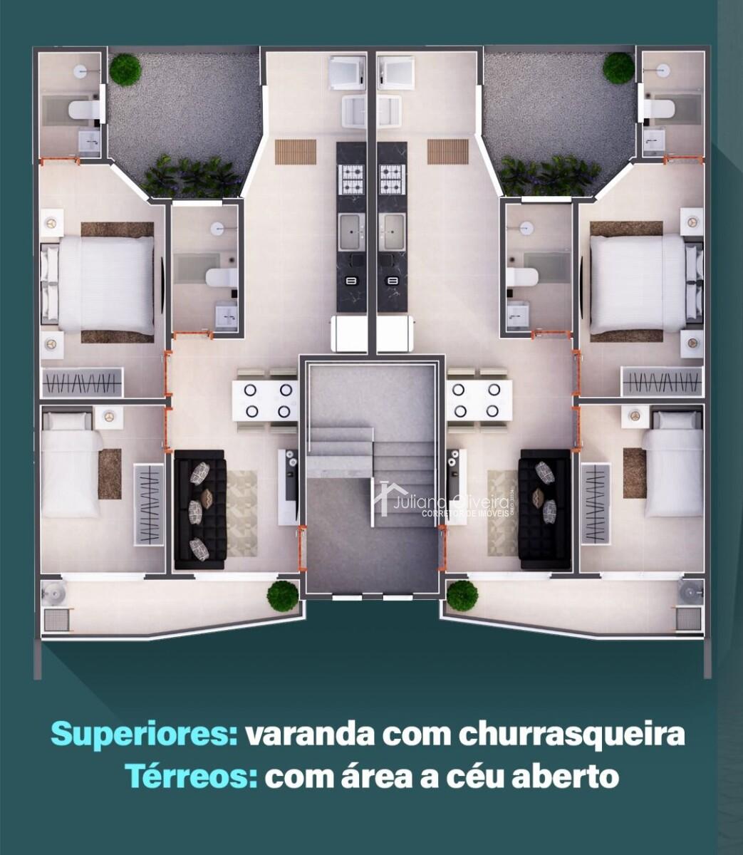 Térreos com 56,69m² de área privativa, contendo: 2 quartos sendo 1 suíte, sala, banheiro social, cozinha, área de serviço, um quintal pequeno e 1 vaga de garagem.