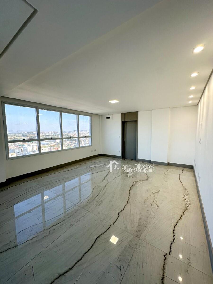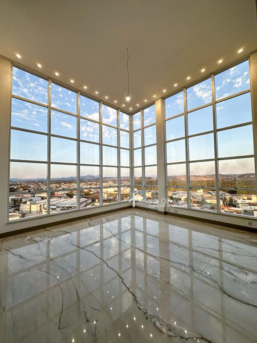 Pé-direito duplo na sala com piso em quartzito Mont Blanc
