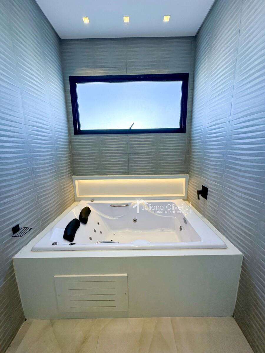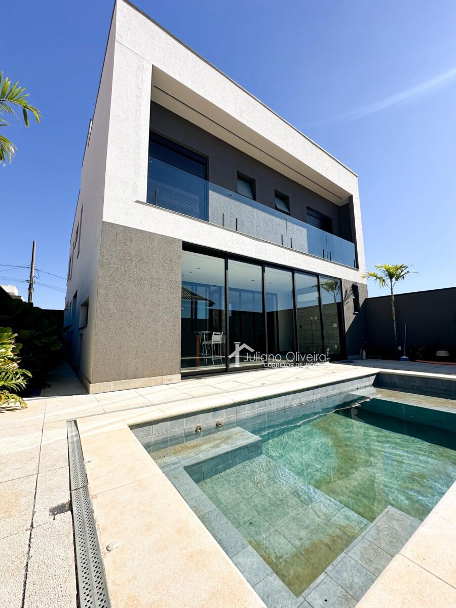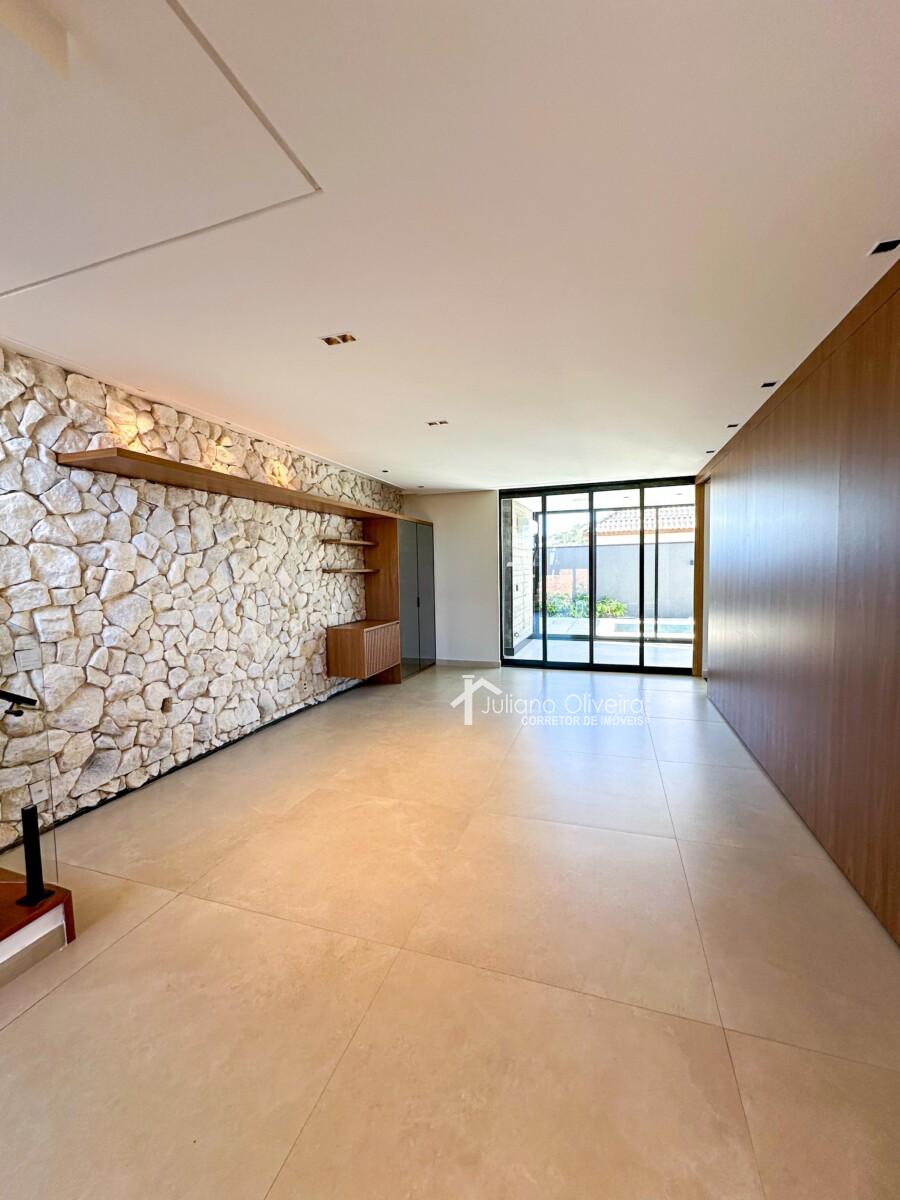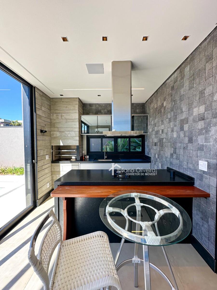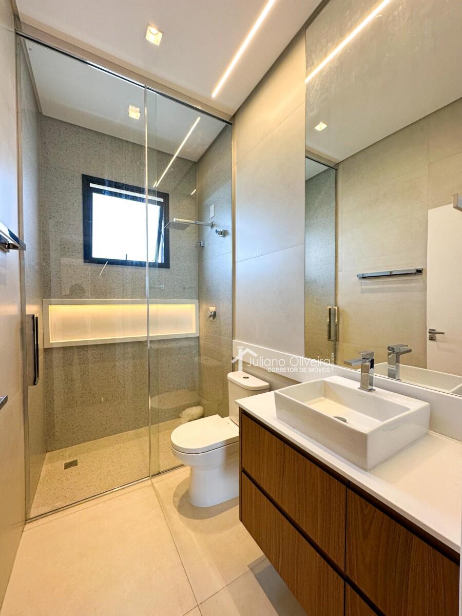 Casa com 298m² de área construída sobre o terreno de 300m², contendo: 3 suítes com closet, ampla de estar, sala de jantar, banheiro social, cozinha com planejados, área gourmet integrada com churrasqueira e revestimento cimentício, piscina e 06 vagas de garagem.